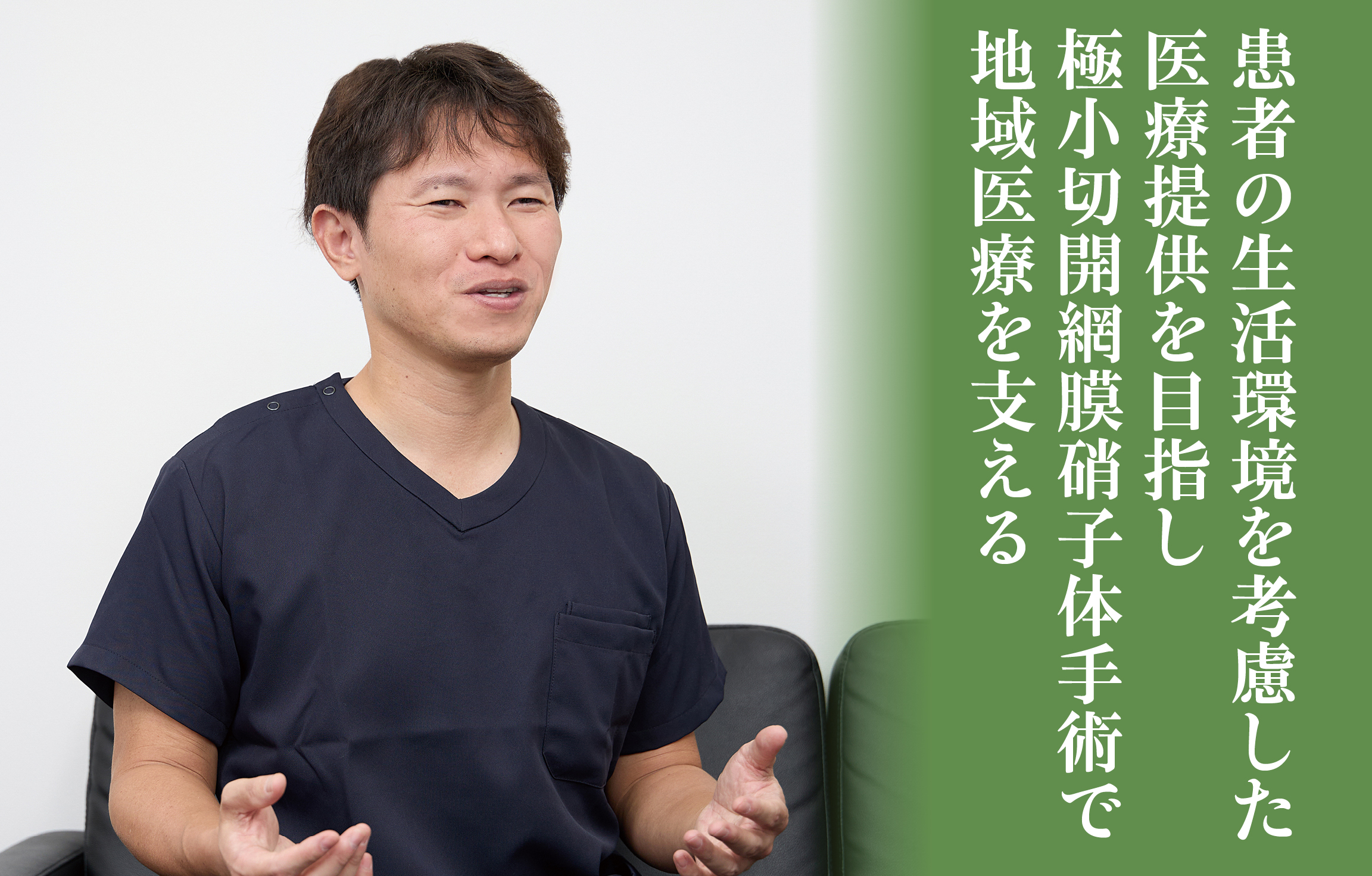 「網膜硝子体手術は、局所麻酔後、白眼の部分に小さな穴を3〜4ケ所開け、専用の器具で濁りや出血を取り除きます。極小切開網膜硝子体手術は、傷口が小さいため術後の異物感や炎症も抑えられ、痛みがなければ1時間程度で帰宅することができます。術後は、1週間程度入院するのが一般的ですが、日帰り手術でも手術成順に差はありません」と、語る浅岡丈治眼科部長は、難症例も積極的に受け入れており、白内障の術中における不測の事態にも即時に対応しているという。