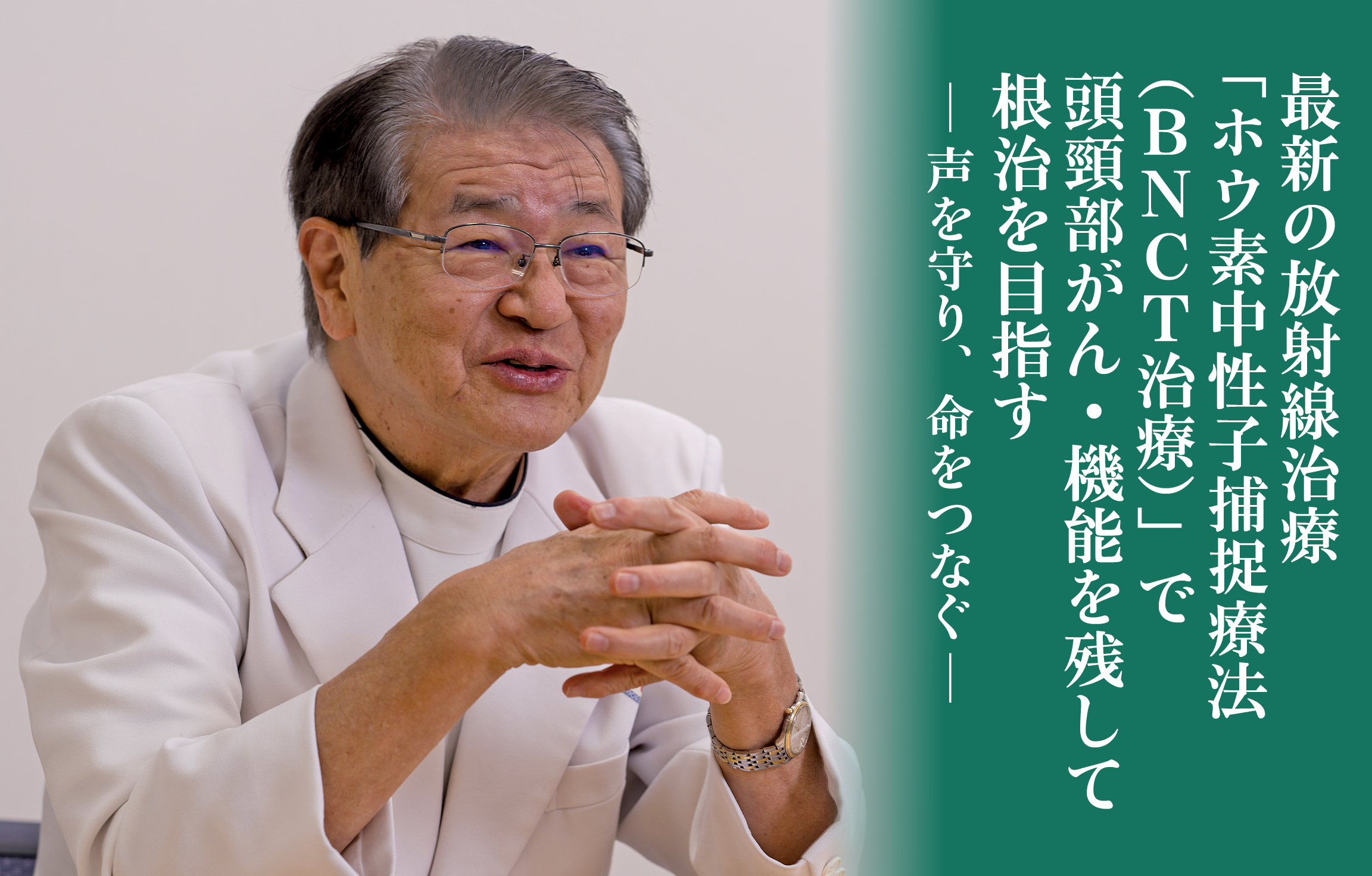 「咽喉頭がんの場合、外科手術で喉頭を摘出すると声を失います。以前、連れ合いの方の介護をされている方で、どうしても声を失うわけにはいかない。通常の放射線治療はできず、手術は避けたいと当院にいらして、BNCT治療で声を温存しつつ根治を目指すことができました」と、髙井センター長は当時を振り返り、想いを続けて語る。
