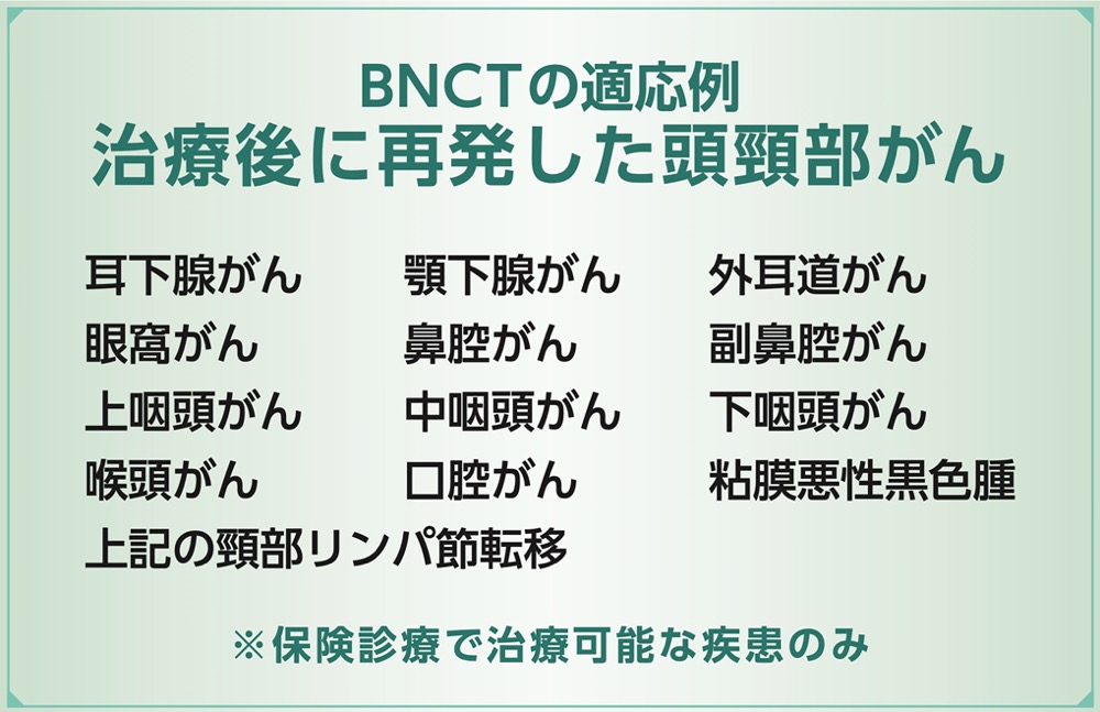 BNCT治療の適応は成人に限られ、切除不能で局所進行しているものと、再発の頭頸部がんに限定される。しかし従来の放射線治療では、正常細胞の被曝への配慮から難しいとされてきた再照射が、2回程度まで可能だという。