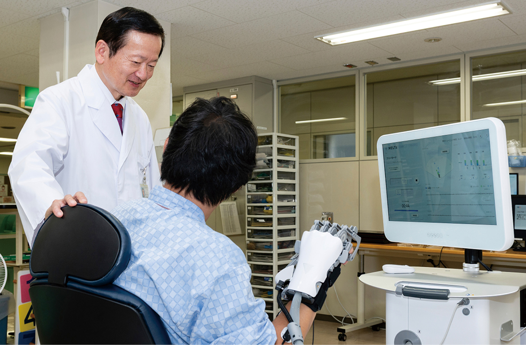 「かつて、二度と回復しないと考えられてきた脳卒中における手足の麻痺ですが、1990年代半ばに、脳卒中等で脳が損傷しても集中的なリハビリを行えば脳機能が再生する、リハビリによる脳の可塑性が証明されました。当院では、症状に合わせた様々なリハビリを行っており、特に脳科学・神経科学の知見を応用したニューロリハビリテーションに注力しております」と語るリハビリテーション科診療部長の道免和久主任教授は、時代とともに変化を遂げるリハビリテーションの可能性に着目し、2002年にアメリカからCI療法(脳卒中による上肢の麻痺側に対する集中的リハビリテーション)を導入するなど、日本におけるリハビリテーションの発展に尽力してきた。